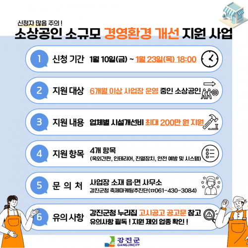 ÇØ´ç »ç¾÷ÀÇ ÁÖ¿ä ³»¿ëÀº ¡ãÁö¿ø ±Ý¾×(°ø±Þ°¡¾×ÀÇ 70%, ÃÖ´ë 200¸¸ ¿øÁö¿ø) ¡ãÁö¿ø ´ë»ó(»ç¾÷ °ø°íÀÏ ±âÁØ 6°³¿ù ÀÌ»ó °Áø±º ³»¿¡¼ »ç¾÷ÀåÀ» ¿î¿µ ÁßÀÎ ¼Ò»ó°øÀÎ ´Ü, 2023³â ¹× 2024³â Áö¿øÀ» ¹ÞÀº ¼Ò»ó°øÀÎÀº ´ë»ó¿¡¼ Á¦¿Ü)À¸·Î ¡ãÁö¿ø Ç׸ñ(¿Á¿Ü °£ÆÇ, ³»ºÎ ÀÎÅ׸®¾î, Áø¿ ÀåÄ¡, ¾ÈÀü ¹× ¹æ¹ü ½Ã½ºÅÛ µî)ÀÌ ±¸¼ºµÇ¾î ÀÖ´Ù.