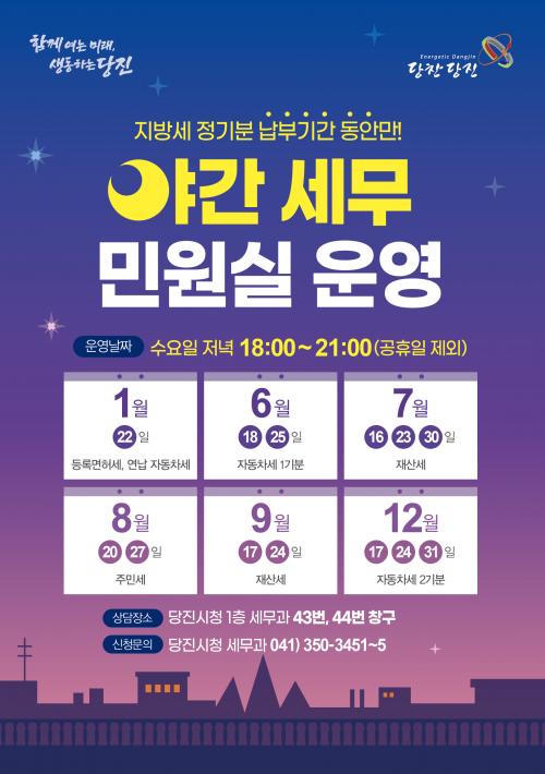 ¡º¾ß°£ ¼¼¹«¹Î¿ø½Ç¡»Àº Áö¹æ¼¼ Á¤±âºÐ ³³ºÎ ±â°£ Áß ¼ö¿äÀÏ ¿ÀÈÄ 6½ÃºÎÅÍ 9½Ã±îÁö 3½Ã°£ µ¿¾È ´çÁø½Ãû 1Ãþ ¼¼¹«°ú 43¹ø°ú 44¹ø ⱸ¿¡¼ ¿î¿µÇϸç, ÀüÈ ¶Ç´Â ¹æ¹®À» ÅëÇØ Áö¹æ¼¼ ³³ºÎ ¹× °¢Á¾ Áö¹æ¼¼ °ü·Ã ¹®ÀÇ¡¤»ó´ã µîÀÇ ÇàÁ¤¼ºñ½º¸¦ Á¦°øÇÒ ¿¹Á¤ÀÌ´Ù.