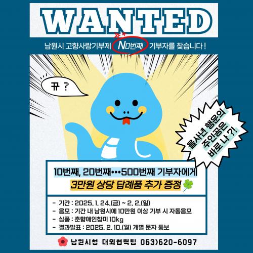 ÇÑÆí, ½Ã´Â ¼³ ¿¬ÈÞ ±â°£ÀÎ 1¿ù 24ÀϺÎÅÍ 2¿ù 2ÀϱîÁö ³²¿ø¿¡ 10¸¸¿ø ÀÌ»ó °íÇâ»ç¶û±âºÎ±ÝÀ» ±âºÎÇÑ ½Ã¹Î Áß Ãß÷À» ÅëÇØ ÃÖ´ë 50¸í¿¡°Ô ÃáÇâ¾ÖÀÎÂü¹Ì 10kgÀ» ÁõÁ¤ÇÏ´Â À̺¥Æ®¸¦ ½Ç½ÃÇÒ °èȹÀÌ´Ù. ±â°£ Áß¿¡ 10¸¸¿ø ÀÌ»ó ±âºÎÇÑ ±âºÎÀÚ´Â ÀÚµ¿À¸·Î À̺¥Æ®¿¡ ÀÀ¸ðµÇ¸ç Ãß÷ °á°ú´Â 2¿ù 10ÀÏ¿¡ °³º° Å뺸µÉ ¿¹Á¤ÀÌ´Ù.