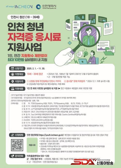 Áö¿ø ´ë»óÀº ½ÅûÀÏ ÇöÀç Áֹεî·Ï»ó ÀÎõ½Ã¿¡ °ÅÁÖÇÏ´Â 18¼¼¿¡¼ 39¼¼(1985³â~2007³â Ãâ»ý) »çÀÌÀÇ ¹ÌÃë¾÷ û³âÀÌ´Ù. Áö¿øµÇ´Â ½ÃÇèÀº 2024³â 12¿ù 1ÀϺÎÅÍ 2025³â 11¿ù 30ÀϱîÁö ÀÀ½ÃÇÑ 600¿© Á¾ÀÇ ±¹°¡±â¼úÀÚ°ÝÁõ, ±¹°¡Àü¹®ÀÚ°ÝÁõ ¹× ±¹°¡°øÀιΰ£ÀÚ°ÝÁõ ½ÃÇè, Çѱ¹»ç´É·Â°ËÁ¤½ÃÇè, °¢Á¾ ¾îÇнÃÇè µîÀÌ Æ÷ÇԵȴÙ.