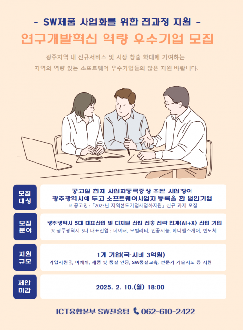 ¸ðÁý ´ë»óÀº °ø°íÀÏ ±âÁØ ±¤Áֽà ¼ÒÀç SW»ç¾÷ÀÚ(ÁÖ »ç¾÷Àå)·Î, ¸ÅÃâ¾× µî ¿¹ºñ¼±µµ±â¾÷ ¼¼ºÎ¿ä°Ç¸¦ ÃæÁ·ÇÑ ±â¾÷ÀÌ´Ù. ±¤Áֽô »ç¾÷¼º Æò°¡¸¦ °ÅÃÄ 1°³ ¼±µµ±â¾÷À» ¼±Á¤ÇØ 3¾ï¿ø(±¹¡¤½Ãºñ)À» Áö¿øÇÑ´Ù.