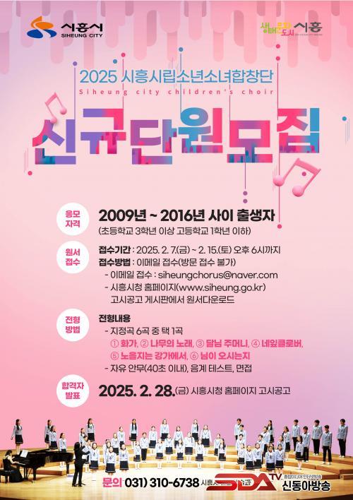 ½Åû ±â°£Àº 2¿ù 7ÀϺÎÅÍ 2¿ù 15ÀÏ ¿ÀÈÄ 6½Ã±îÁöÀ̸ç, ½ÃÈï½Ãû ´©¸®Áý °í½Ã/°ø°í °Ô½ÃÆÇ¿¡¼ ÀÀ½Ã¿ø¼¸¦ ³»·Á¹Þ¾Æ ÀüÀÚ¿ìÆí(siheungchorus@naver.com)À¸·Î ½ÅûÇÏ¸é µÈ´Ù. ¿Àµð¼ÇÀº 2¿ù 22ÀÏ ¿ÀÀü 10½Ã¿¡ ½ÃÈïABCÇູÇнÀŸ¿î 100³â »ó»ó°ü 2Ãþ ½ÃÈï½Ã¸³¼Ò³â¼Ò³àÇÕâ´Ü ¿¬½À½Ç¿¡¼ ÁøÇàµÇ°í, 2¿ù 28ÀÏ ½ÃÈï½Ãû ´©¸®Áý¿¡ ÃÖÁ¾ ÇÕ°ÝÀÚ°¡ ¹ßÇ¥µÈ´Ù.