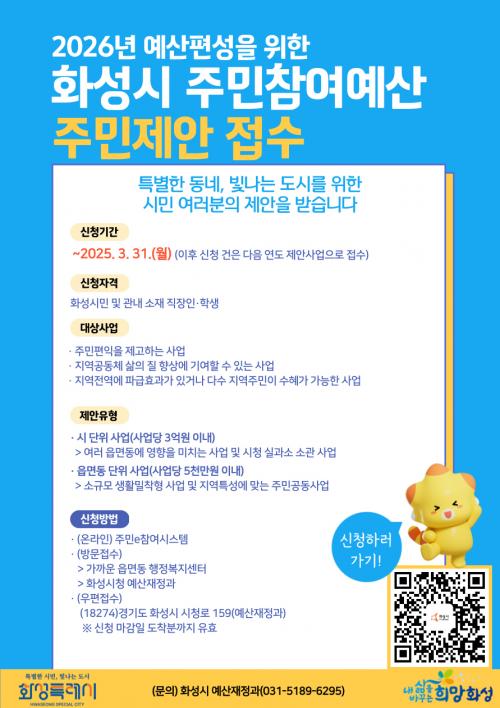 Á¢¼öµÈ Á¦¾È»ç¾÷Àº ÇØ´ç »ç¾÷ºÎ¼ °ËÅä¿Í ÁÖ¹ÎÂü¿©¿¹»êÀ§¿øÈ¸ ½É»ç¸¦ °ÅÃÄ ÃÖÁ¾ ¼±Á¤µÇ¸ç, ¼±Á¤µÈ Á¦¾È»ç¾÷Àº 2026³â ¿¹»ê¿¡ ¹Ý¿µµÈ´Ù.