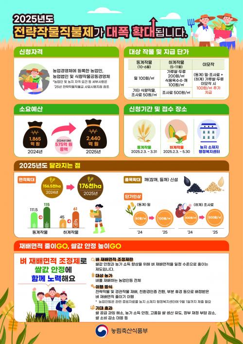 Àü·«ÀÛ¹° Á÷ºÒÁ¦´Â ½Ò ¼ö±Þ ¾ÈÁ¤°ú ½Ä·®ÀÚ±Þ·ü Çâ»óÀ» À§ÇØ °Ü¿ïö ³í¿¡ º¸¸®, ¹Ð, Á¶»ç·á¸¦, ¿©¸§Ã¶ µÎ·ù, °¡·ç½Ò, ÇϰèÁ¶»ç·á µîÀ» Àç¹èÇϸé ǰ¸ñ¿¡ µû¶ó ha´ç ÃÖ´ë 500¸¸ ¿øÀÇ Á÷ºÒ±ÝÀ» Áö¿øÇÏ´Â »ç¾÷ÀÌ´Ù.