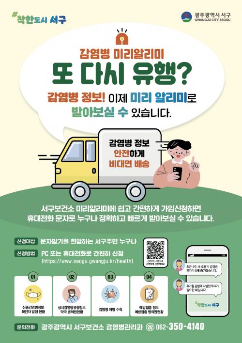¼±¸´Â °¨¿°º´ Á¤º¸¸¦ ´ã´çÇÏ´Â °ø¹«¿øÀ» µû·Î ÁöÁ¤ÇØ Áֹε鿡°Ô ÁÖ1ȸ ÀÌ»ó ÈÞ´ëÀüÈ ¹®ÀÚ·Î Á¤º¸¸¦ Á¦°øÇÒ ¿¹Á¤ÀÌ´Ù. ¼±¸¹Î ´©±¸³ª ±¤ÁÖ ¼±¸º¸°Ç¼Ò ´©¸®Áý(º¸°Ç¼Ò»ç¾÷-°¨¿°º´°ü¸®»ç¾÷-°¨¿°º´ ¹Ì¸®¾Ë¸®¹Ì ¾È³»)¿¡¼ ¡®¹Ì¸®¾Ë¸®¹Ì¡¯ ¼ºñ½º ½ÅûÀÌ °¡´ÉÇϸç, ½ÅûÀÚ´Â Á¤±âÀûÀ¸·Î °¨¿°º´ À¯Çà »óȲ ¹× ¿¹¹æ¼öÄ¢, ¿¹¹æÁ¢Á¾ Á¤º¸, Ä¡·á±â°ü ¾È³» µîÀÇ ³»¿ëÀ» ¹®ÀÚ·Î ¹Þ¾Æº¼ ¼ö ÀÖ´Ù.
