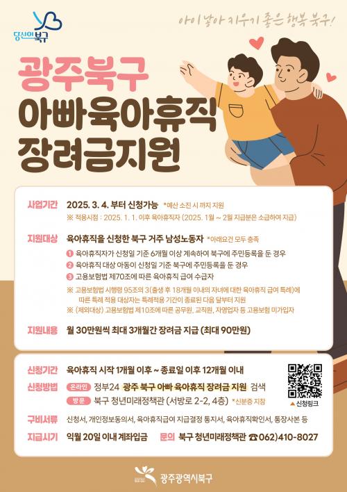 ¡®¾Æºü À°¾ÆÈÞÁ÷ Àå·Á±Ý¡¯ Áö¿øÀº ¾ÆÀÌ ³º¾Æ Ű¿ì±â ÁÁÀº ºÏ±¸ Á¶¼º»ç¾÷ÀÇ ÀÏȯÀ¸·Î À°¾ÆÈÞÁ÷ ÁßÀÎ ³²¼º ³ëµ¿ÀÚ¿¡°Ô ¿ù 30¸¸ ¿øÀÇ Àå·Á±ÝÀ» ÃÖ´ë 3°³¿ù°£ Áö±ÞÇÏ¿© ÈÞÁ÷¿¡ µû¸¥ °æÁ¦Àû ºÎ´ãÀ» ¿ÏÈÇÏ°í ³²¼ºÀÇ À°¾ÆÈÞÁ÷À» Àå·ÁÇϰíÀÚ ºÏ±¸¿¡¼ ¿ÃÇØ óÀ½ ÃßÁøÇÏ´Â ½ÃÃ¥ÀÌ´Ù.