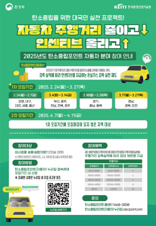 Âü¿©¸¦ Èñ¸ÁÇÏ´Â ½Ã¹ÎÀº ÀÚµ¿Â÷ ź¼ÒÁ߸³Æ÷ÀÎÆ®Á¦ ´©¸®Áý¿¡ (https://car.cpoint.or.kr) ȸ¿øÀ¸·Î °¡ÀÔ ÈÄ ÀÚµ¿Â÷ Àü¸é(¹øÈ£ÆÇ) »çÁø, ÁÖÇà°Å¸® °è±âÆÇ »çÁø µîÀ» ÁõºùÀÚ·á·Î Á¦ÃâÇÏ¸é µÈ´Ù. ¼±Âø¼øÀ¸·Î ¸ðÁýÇϸç Âü¿© °ü·Ã ÀÚ¼¼ÇÑ »çÇ×Àº Çѱ¹È¯°æ°ø´Ü¿¡ ¹®ÀÇÇÏ¸é ¾È³»¹ÞÀ» ¼ö ÀÖ´Ù.