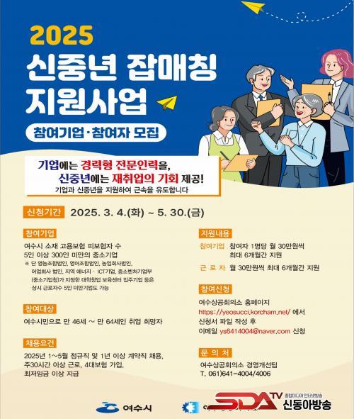 ¿©¼ö»ó°øÈ¸ÀǼҴ Ãë¾÷À» Èñ¸ÁÇÏ´Â ½ÅÁß³âÃþÀÇ Àû±ØÀûÀÎ Âü¿©¸¦ Àå·ÁÇϰí ÀÖÀ¸¸ç, ¸ðÁýÀº 2025³â 3¿ù 4ÀϺÎÅÍ 5¿ù 30ÀϱîÁö ÁøÇàµÈ´Ù. Âü¿©¸¦ ¿øÇÏ´Â ±â¾÷°ú ±Ù·ÎÀÚ´Â ¿©¼ö»ó°øÈ¸ÀÇ¼Ò È¨ÆäÀÌÁö ½Åû(https://yeosucci.korcham.net/) ¶Ç´Â °æ¿µ°³¼±ÆÀ(061-641-4004)À¸·Î ¹®ÀÇÇÏ¸é µÈ´Ù.
