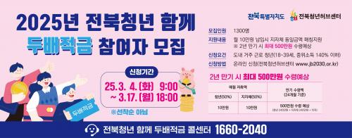 ¡®ÀüºÏû³â ÇÔ²² µÎ¹èÀû±Ý¡¯À» ÅëÇØ û³âÀÌ ¿ù 10¸¸ ¿ø¾¿ 2³â°£ ÀúÃàÇÏ¸é º»ÀÎ ÀúÃà¾× 240¸¸ ¿ø°ú ³²¿ø½Ã Áö¿ø¾× 240¸¸ ¿ø, ÀÌÀÚ¸¦ ÇÕ»êÇØ ÃÖ´ë 500¸¸ ¿ø±îÁö ¸ñµ·À» ¸¶·ÃÇÒ ¼ö ÀÖ´Ù.
