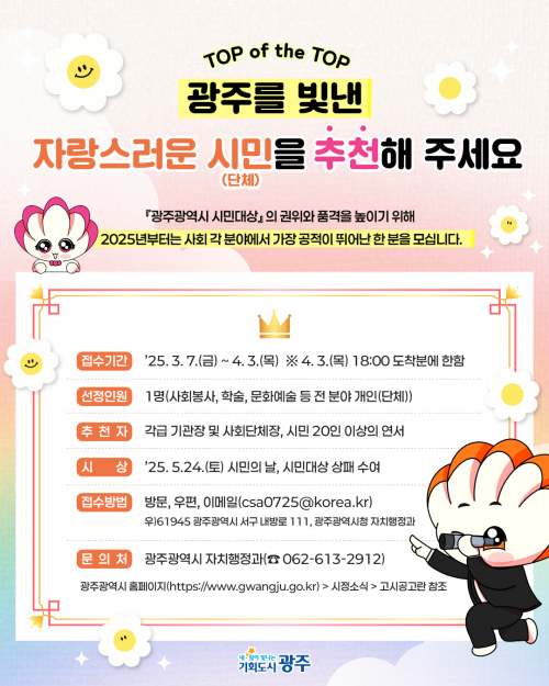 ½Ã¹Î´ë»ó Èĺ¸ÀÚ´Â ±¤Áֽà ´©¸®Áý °ø°íÀÏ(2¿ù28ÀÏ) ±âÁØ 3³â ÀÌ»ó ±¤Áֽÿ¡ °ÅÁÖÇÏ¸é¼ ±¤ÁÖ½ÃÀÇ ¸í¿¹¿Í Áö¿ª¹ßÀü¿¡ °øÀûÀÌ ÀÖ´Â »ç¶÷(´Üü)À¸·Î, °¢±Þ ±â°üÀå ¶Ç´Â »çȸ´ÜüÀå, ½Ã¹Î 20ÀÎ ÀÌ»ó ¿¬¼·Î ÃßõÇÒ ¼ö ÀÖ´Ù.