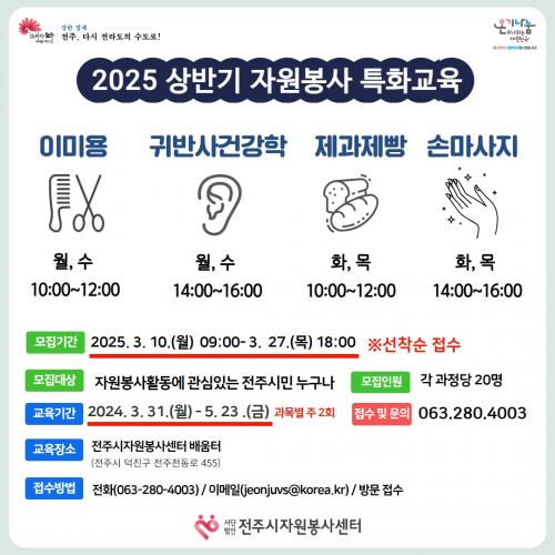 ±³À°Àº ÀüÁֽùÎÀÌ¸é ´©±¸³ª ½ÅûÇÒ ¼ö ÀÖÀ¸¸ç, ½Åû¼ ¹× ÀÚ¼¼ÇÑ »çÇ×Àº ÀüÁÖ½ÃÀÚ¿øºÀ»ç¼¾ÅÍ ´©¸®Áý(www.jeonjuvc.or.kr)¿¡¼ ³»·Á¹ÞÀº ½Åû¼¸¦ ÀÛ¼ºÇØ ½ÅûÇÏ¸é µÈ´Ù.