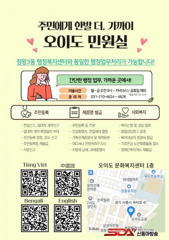 Á¤¿Õ3µ¿ ÇàÁ¤º¹Áö¼¾ÅÍ´Â ¿ÀÀ̵µ ¹Î¿ø½Ç ÀÌ¿ë Ȱ¼ºÈ¸¦ À§ÇØ È«º¸¹°À» Á¦ÀÛÇØ ¿ÁÅÍÃʵîÇб³, ¿ÀÀ̵µ ¹®Èº¹Áö¼¾ÅÍ µî °ü°è±â°üÀ» ÅëÇØ ¹èÆ÷ÇÒ ¿¹Á¤ÀÌ´Ù. ¶ÇÇÑ, ¿Ü±¹ÀÎ ÁÖ¹ÎÀÇ ÆíÀǸ¦ °í·ÁÇØ º£Æ®³²¾î, ¹æ±Û¶óµ¥½Ã¾î, Áß±¹¾î, ¿µ¾î·Î Á¦°øµÇ´Â Å¥¾Æ¸£ Äڵ带 º°µµ·Î Á¦ÀÛÇØ ¾È³»ÇÒ °èȹÀÌ´Ù.