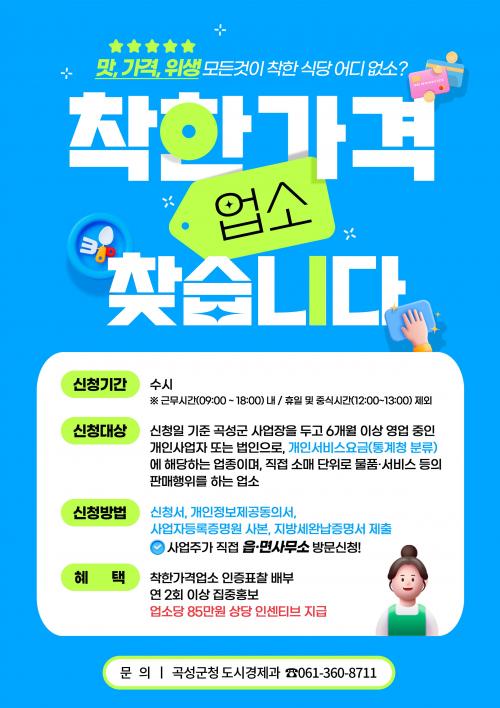 ÂøÇѰ¡°Ý¾÷¼Ò´Â »ç¾÷ÁÖÀÇ ½Åû ¶Ç´Â ÃßõÀ» ÅëÇØ ¼±¹ßµÈ´Ù. ½ÅûÀ» Èñ¸ÁÇÏ´Â »ç¾÷ÁÖ´Â 3¿ù 18ÀϺÎÅÍ ¿¬Áß ¾ðÁ¦µç »ç¾÷Àå ¼ÒÀçÁö À¾¡¤¸é»ç¹«¼Ò¿¡¼ ½ÅûÇÒ ¼ö ÀÖ´Ù. ÂøÇѰ¡°Ý¾÷¼Ò ȨÆäÀÌÁö (www.goodprice.go.kr)¸¦ ÅëÇØ Ãßõ ¹ÞÀº »ç¾÷Àåµµ ½Å±Ô ÁöÁ¤ ´ë»óÀÌ µÉ ¼ö ÀÖ´Ù. ÀÌÈÄ ÇöÁö ½Ç»çÆò°¡, Àû°Ý½É»ç µîÀ» ÅëÇØ ÁöÁ¤ ¿©ºÎ°¡ °áÁ¤µÈ´Ù.
