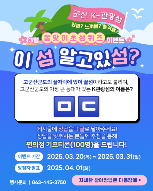 4¿ù¿¡´Â 14ÀϺÎÅÍ 18ÀϱîÁö ¡®K-°ü±¤¼¶(°í±º»ê±ºµµ) ½ÅÃá¹®¿¹¡¯ ÁÖ°£ÀÌ ¿î¿µµÈ´Ù. K-°ü±¤¼¶°ú °í±º»ê±ºµµ¸¦ ÁÖÁ¦·Î À¯ÄèÇϰí Àç¹ÌÀÖ´Â 30ÀÚ(¶ç¾î¾²±â Æ÷ÇÔ) À̳»ÀÇ ÂªÀº ½Ã¸¦ âÀÛÇØ ´ñ±Û·Î ³²±â¸é µÈ´Ù. ´ç¼±ÀÛÀº ´ñ±Û ¡®ÁÁ¾Æ¿ä¡¯ÀÇ ¼ö µîÀ» ±âÁØÀ¸·Î 30¸íÀ» ¼±Á¤Çϸç, »óǰÀ¸·Î ¼ÒÁ¤ÀÇ ¸ð¹ÙÀÏ »óǰ±ÇÀ» ÁØ´Ù..