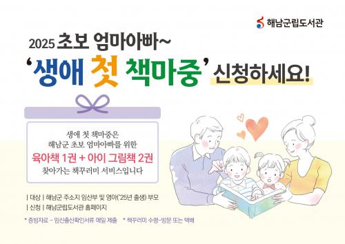 »ý¾Ö ù Ã¥¸¶Áß ¼­ºñ½º´Â ÇØ³²±º¿¡ ÁÖ¼Ò¸¦ µÐ ÀӽźΠ¹× ¿µ¾Æ(2025³â Ãâ»ý) ºÎ¸ð¿¡°Ô À°¾Æ °ü·Ã Á¤º¸¸¦ Á¦°øÇϰí, ¾ÆÀÌ¿¡°Ô ù Ã¥À» ¼±¹°ÇÏ´Â ±âȸ¸¦ ¸¶·ÃÇϰíÀÚ À°¾ÆÃ¥°ú ¾ÆÀ̱׸²Ã¥À¸·Î ±¸¼ºµÈ Ã¥ ²Ù·¯¹Ì¸¦ ¼±¹°ÇÏ´Â »ç¾÷À¸·Î ¿À´Â 4¿ùºÎÅÍ ½Åû°¡´ÉÇÏ´Ù.