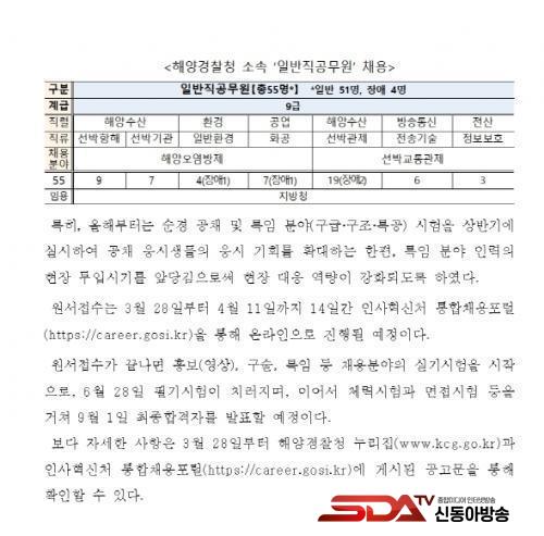 ÀϹÝÁ÷°ø¹«¿øÀº ÃÑ 55¸íÀ¸·Î, 9±Þ ÇØ¾ç¿À¿°¹æÁ¦ ºÐ¾ß 27¸í(▴¼±¹ÚÇ×ÇØ 9¸í, ▴¼±¹Ú±â°ü 7¸í, ▴ÀϹÝȯ°æ 4¸í, ▴Ȱø 7¸í) ¹× ¼±¹Ú±³Åë°üÁ¦ ºÐ¾ß 28¸í(▴¼±¹Ú°üÁ¦ 19¸í, ▴Àü¼Û±â¼ú 6¸í, ▴Á¤º¸º¸È£ 3¸í)À» ½Å±Ô ä¿ëÇÒ ¿¹Á¤À̸ç,