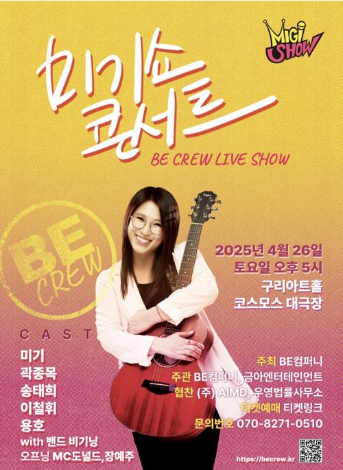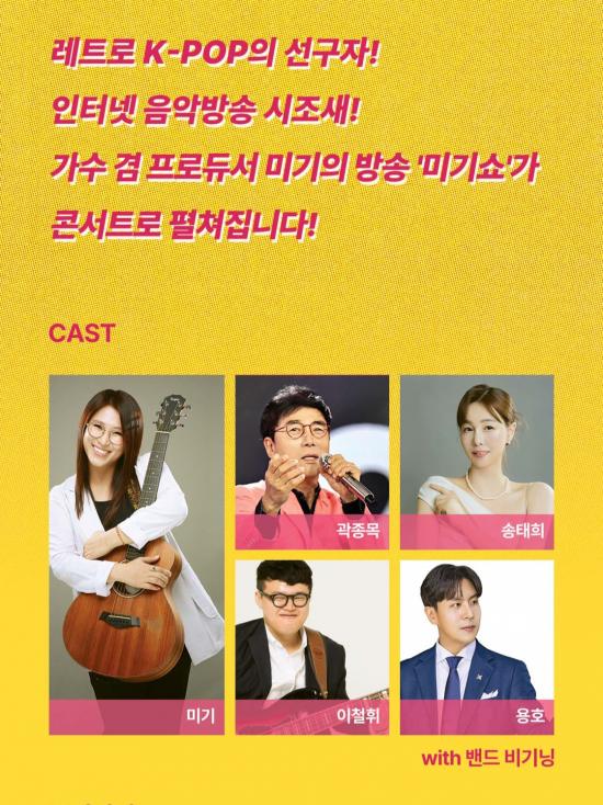 [½Åµ¿¾Æ¹æ¼Û=½Å°æ½Ä ±âÀÚ] ·¹Æ®·Î K-POPÀÇ ¼±±¸ÀÚ, ÀÎÅÍ³Ý À½¾Ç¹æ¼ÛÀÇ ½ÃÁ¶»õ¶ó ºÒ¸®¸ç ±×Áý¾Õ, õ³âÁö±â µî ¼ö¸¹Àº Ãß¾ïÀÇ °îµéÀ» ¿ªÁÖÇà ½ÃŲ ÁÖÀΰø, °¡¼ö °â ÇÁ·Îµà¼­ ¹Ì±â°¡ ¿À´Â 4¿ù 26ÀÏ ±¸¸®¾ÆÆ®È¦ ÄÚ½º¸ð½º ´ë±ØÀå¿¡¼­ Äܼ­Æ®¸¦ ÆîÄ£´Ù. À̹ø Äܼ­Æ®´Â ±×°¡ ÁøÇàÇÏ´Â ¹æ¼Û '¹Ì±â¼î'¸¦ °ø¿¬À¸·Î È®ÀåÇÑ '¹Ì±â¼î Äܼ­Æ®'·Î ¿Â¶óÀο¡¼­ º¸¿©ÁÖ¾ú´ø ¿­Á¤ÀÇ ¶óÀ̺긦 ÇöÀå¿¡¼­ ¹êµå¿Í ÇÔ²² ´õ¿í Ä¿´Ù¶õ ¿¡³ÊÁö·Î ÁõÆø½ÃŰ´Â ¶ß°Å¿î ÇöÀå °ø¿¬ÀÌ µÉ °ÍÀ̶ó °ü°èÀÚ´Â ÀüÇÑ´Ù. ¹Ì±â¿Í ÀýÄ£À¸·Î ¹Ì±â¿Í ÇÔ²² µà¿§¹«´ë ¹æ¼ÛÃ⿬µî Ȱ¹ßÇÑ È°µ¿À» º¸¿©Áֱ⵵ ÇÑ 7080ÀÇ ´ëÇ¥±×·ì °Ç¾ÆµéÀÇ º¸Äà °ûÁ¾¸ñµµ À̹ø Äܼ­Æ®¿¡ ÇÔ²² ÇÑ´Ù. ÃÖ±Ù '¶±»ó°¢'À¸·Î ¼Ö·Î Ȱµ¿¿¡µµ ¸ÅÁøÇϰí ÀÖ´Â °ûÁ¾¸ñÀº ´Ù¾çÇÑ ¹«´ë¸¦ ÅëÇØ ¹Ì±â¼î Äܼ­Æ®¿¡ ´ÙÀ̳ª¹ÍÀ» ´õÇÒ ¿¹Á¤ÀÌ´Ù. ¶ÇÇÑ ÀÛ°î°¡À̱⵵ ÇÑ ¹Ì±âÀÇ °îÀ¸·Î ¿Õ¼ºÇÑ È°µ¿À» º¸¿©ÁÖ°í ÀÖ´Â ¹Ì½ºÅÍÆ®·Ô2ÀÇ ¿ëÈ£(´ëÇ¥°î : Çâ±â ¾ø´Â ²É)¿Í »óÅ­ÇÑ º¸À̽º·Î µ¿¼­³²ºÏÀ¸·Î Ȱµ¿À» È®ÀåÇϰí ÀÖ´Â ¼ÛÅÂÈñ(´ëÇ¥°î : ²É±¸¸§)µµ Ãâ¿¬ÇØ ¹«´ë¸¦ ´Ùä·Ó°Ô ²Ù¹Î´Ù. ¹Ì±âÀÇ À½¾ÇÆÀ ºñÀÌÅ©·ç¿¡¼­ ¸¹Àº °îµéÀ» Æí°îÇÑ º£À̽ýºÆ®ÀÌÀÚ À½¾Ç°¨µ¶ÀÎ ÀÌöÈÖµµ ¿À·£¸¸¿¡ ¿¬ÁÖÀڷμ­ ¹«´ë¿¡ ¿À¸¥´Ù.