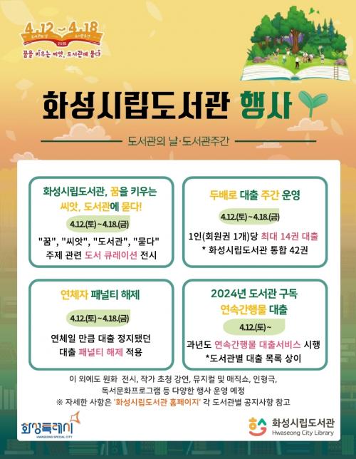¿ÃÇØ µµ¼°üÁÖ°£¿¡´Â ¡®²ÞÀ» Ű¿ì´Â ¾¾¾Ñ, µµ¼°ü¿¡ ¹¯´Ù¡¯¸¦ ÁÖÁ¦·Î, ȼº½Ã¸³µµ¼°ü 30°³¼Ò(°ø°øµµ¼°ü 20°³¼Ò, ÀÛÀºµµ¼°ü 10°³¼Ò)¿¡¼ 130¿© °³ÀÇ °ø¿¬, Àü½Ã, µ¶¼¹®È ÇÁ·Î±×·¥, ÀÛ°¡¿ÍÀÇ ¸¸³² ÇÁ·Î±×·¥ÀÌ ¿î¿µµÈ´Ù.