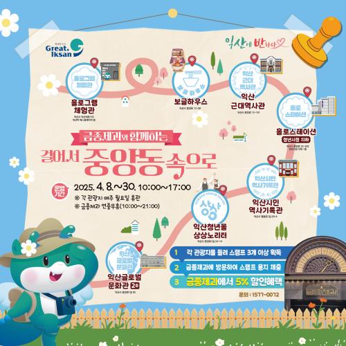 ÀÍ»ê½Ã´Â '°É¾î¼ Áß¾Óµ¿ ¼ÓÀ¸·Î' ½ºÅÆÇÁ Åõ¾î¸¦ ¿À´Â 30ÀϱîÁö ÁøÇàÇÑ´Ù°í 8ÀÏ ¹àÇû´Ù. Áß¾Óµ¿ÀÇ ´ëÇ¥ÀûÀÎ ¸í¼Ò 7°÷ Áß 3°÷¿¡¼ µµÀåÀ» Âï°í ±ÝÁ¾Á¦°ú¸¦ ¹æ¹®Çϸé 5%ÀÇ ÇÒÀÎ ÇýÅõµ Á¦°ø¹ÞÀ» ¼ö ÀÖ´Ù.