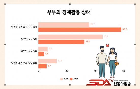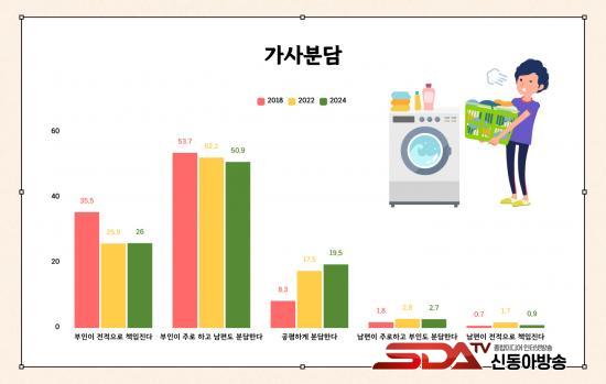 Á¶»ç °á°ú, ¸Â¹úÀÌ ºÎºÎ ºñÀ²Àº 2018³â 35.7%, 2022³â 50.3%¿¡ À̾î 2024³â 58.3%·Î ²ÙÁØÈ÷ Áõ°¡Çϰí ÀÖÀ¸³ª, °¡»ç ºÐ´ã¿¡ ´ëÇÑ ÀνÄÀº ¿©ÀüÈ÷ ÀüÅëÀû ¼º ¿ªÇÒ¿¡¼­ Å©°Ô ¹þ¾î³ªÁö ¸øÇϰí ÀÖ´Â °ÍÀ¸·Î ³ªÅ¸³µ´Ù. °¡»ç ºÐ´ãÀº ¡®ºÎÀÎÀÌ ÁÖ·Î ÇÏ°í ³²Æíµµ ºÐ´ãÇÑ´Ù¡¯´Â ÀÀ´äÀÌ 50.9%·Î °¡Àå ¸¹¾Ò°í, ¡®°øÆòÇÏ°Ô ºÐ´ãÇÑ´Ù¡¯´Â ÀÀ´äÀº 19.5%¿¡ ±×ÃÆ´Ù. ƯÈ÷ ¸Â¹úÀÌ ºñÀ²ÀÌ °¡Àå ³ôÀº 40´ë¿¡¼­´Â ¡®ºÎÀÎÀÌ ÁÖ·Î ÇÑ´Ù¡¯´Â ÀÀ´äÀÌ 63.0%¿¡ ´ÞÇØ °¡»ç³ëµ¿ÀÇ ¼ºº° ºÒ±ÕÇüÀÌ µÎµå·¯Á³´Ù.