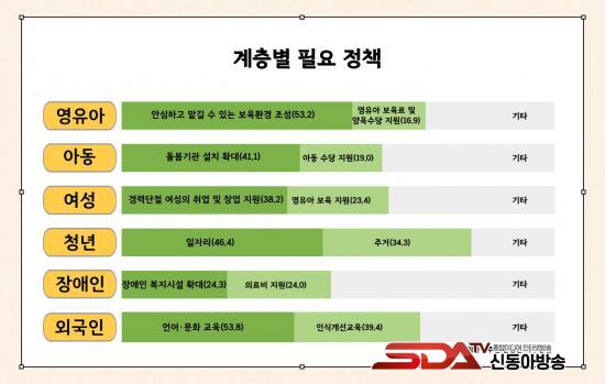 ¾Æ¿ï·¯, »çȸ °èÃþº° ÇÊ¿ä Á¤Ã¥À¸·Î´Â ¿µÀ¯¾Æ´Â ¡®¾È½ÉÇÏ°í ¸Ã±æ ¼ö ÀÖ´Â º¸À° ȯ°æ Á¶¼º¡¯(53.2%), ¾Æµ¿Àº ¡®µ¹º½±â°ü ¼³Ä¡ È®´ë¡¯(41.1%), ¿©¼ºÀº ¡®°æ·Â ´ÜÀý ¿©¼ºÀÇ Ãë¾÷ ¹× â¾÷ Áö¿ø¡¯(38.2%), û³âÀº ¡®ÀÏÀÚ¸® È®´ë ¹× â¾÷ Áö¿ø¡¯(46.4%)À» °¡Àå Áß¿äÇÑ Á¤Ã¥À¸·Î ²ÅÇû´Ù. ¿Ü±¹ÀÎ ÁÖ¹ÎÀÇ ¼º°øÀûÀÎ Á¤ÂøÀ» À§ÇÑ Á¤Ã¥À¸·Î´Â ¡®¾ð¾î¤ý¹®È­ ±³À°¡¯(53.8%)ÀÌ °¡Àå ³ô¾ÒÀ¸¸ç, Àå¾ÖÀÎ º¹Áö»ç¾÷¿¡ ÇÊ¿äÇÑ Á¤Ã¥Àº ¡®Àå¾ÖÀÎ º¹Áö½Ã¼³ È®´ë¡¯(24.3%)·Î ³ªÅ¸³µ´Ù. ½Ã´Â °èÃþº° Á¤Ã¥ ¼ö¿ä¸¦ ¹Ý¿µÇØ ¸ÂÃãÇü º¹Áö ¹× Áö¿ø ¹æ¾ÈÀ» Àû±ØÀûÀ¸·Î ¸ð»öÇØ ³ª°¥ ¹æÄ§ÀÌ´Ù.