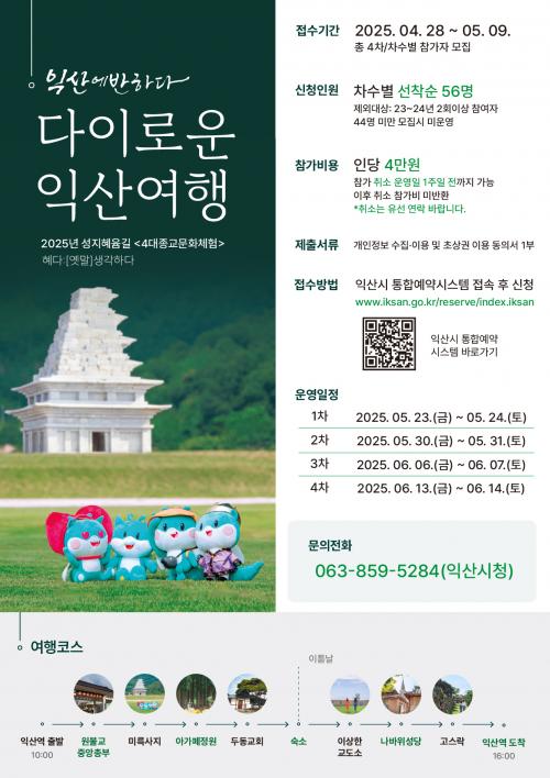 Âü°¡ ½ÅûÀº 4¿ù 28ÀϺÎÅÍ 5¿ù 9ÀϱîÁö ÁøÇàµÇ¸ç, Âü°¡ºñ´Â 1Àδç 4¸¸ ¿øÀÌ´Ù. ½ÅûÀº ÀÍ»ê½Ã ÅëÇÕ¿¹¾à½Ã½ºÅÛ ´©¸®Áý(www.iksan.go.kr/reserve/index.iksan)¿¡¼ ÇÒ ¼ö ÀÖ´Ù.