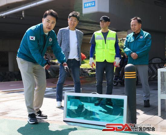 ¿À¾ð¼® µµºÀ±¸Ã»ÀåÀÌ ¹°¸·ÀÌÆÇ ¼³Ä¡¸¦ ½Ã¿¬Çϰí ÀÖ´Ù(2025. 4. 28. µµºÀõ µÐÄ¡)(»çÁø ¿ÞÂÊ Ã¹ ¹øÂ° ¿À¾ð¼® µµºÀ±¸Ã»Àå)