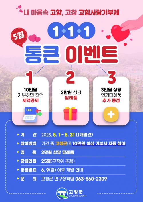 °íⱺ °ü°èÀÚ´Â ¡°5¿ù °¡Á¤ÀÇ ´ÞÀ» ¸Â¾Æ °íÇâÀ» »ç¶ûÇÏ´Â ¸¶À½À» ÀüÇÏ´Â ±âºÎÀڵ鿡°Ô °¨»çÀÇ ¸¶À½À» Ưº°ÇÑ ÇýÅÃÀ¸·Î º¸´äÇϰíÀÚ À̹ø À̺¥Æ®¸¦ ¸¶·ÃÇß´Ù¡±¶ó¸ç, ¡°À̹ø ¡®1+1+1 ÅëÅ« À̺¥Æ®¡¯¸¦ ÅëÇØ ´õ ¸¹Àº ºÐµéÀÌ °íÇâ»ç¶û±âºÎÁ¦¿¡ µ¿ÂüÇϰí, °íâÀÇ ¸Å·ÂÀ» ´À²¸º¸½Ã±æ ¹Ù¶õ´Ù¡±¶ó°í ÀüÇß´Ù.