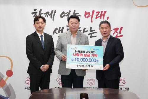Á¤±¤Èñ ´ëÇ¥´Â ¡°¿ì¸²¿¡ÇÁ¿£¾¾´Â Áö¿ª»çȸ¿Í ÇÔ²² ¼ºÀåÇØ ¿Â ±â¾÷À¸·Î¼, µµ¿òÀÌ ÇÊ¿äÇÑ ÀÌ¿ôµé¿¡°Ô Á¶±ÝÀ̳ª¸¶ ÈûÀÌ µÇ°íÀÚ ±âŹÀ» °áÁ¤ÇÏ°Ô µÆ´Ù¡±¸ç ¡°¾ÕÀ¸·Îµµ »çȸÀû Ã¥ÀÓÀ» ´ÙÇϰí Áö¼ÓÀûÀÎ ³ª´®À» ½ÇõÇÏ´Â ±â¾÷ÀÌ µÇ°Ú´Ù¡±°í ¼Ò°¨À» ÀüÇß´Ù.