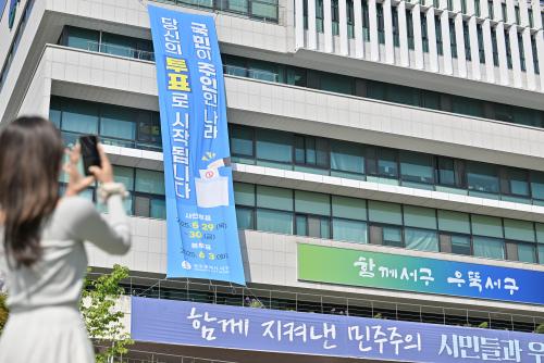 ±¸Ã»»ç ³»¿ÜºÎ Àü±¤ÆÇ°ú 18°³ µ¿ ÇàÁ¤º¹Áö¼¾ÅÍ ÀüÀڰԽôë, ¼±¸¿¡¼ ¿î¿µÇÏ´Â ¿Á¿Ü È«º¸ °Ô½ÃÆÇ, ¼±¸ ´ëÇ¥ ȨÆäÀÌÁö¿Í SNS¿¡µµ ¡®ÅõÇ¥ Âü¿©¡¯¸¦ °Á¶ÇÏ´Â ¸Þ½ÃÁö°¡ ÀÏÁ¦È÷ ¼ÛÃâµÇ°í ÀÖ´Ù. Áö³ 10ÀÏ¿¡´Â ±¸Ã»»ç ¿Üº®¿¡ ´ëÇü Çö¼ö¸·À» ¼³Ä¡ÇØ ÅõÇ¥ ±Ç¸®ÀÇ Á߿伺À» ½Ã¹Îµé¿¡°Ô ȯ±â½Ã۰í ÀÖ´Ù.