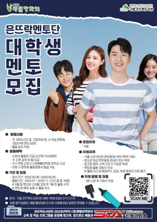 Àº¶ß¶ôµµ¼­°üÀº ¿À´Â 30ÀϱîÁö ¡®Àº¶ß¶ô ¸àÅä´Ü¡¯ÀÇ ´ëÇлý ¸àÅ並 ¸ðÁýÇÑ´Ù. Ȱµ¿ ±â°£ÀÎ 7¿ùºÎÅÍ 11¿ù±îÁö ÇØ¿Ü¿¬¼ö, ÀÔ´ë, Ãë¾÷ ¿¹Á¤ÀÚ¸¦ Á¦¿ÜÇϰí, û¼Ò³â ¸àÅ丵¿¡ °ü½É ÀÖ´Â ¼­¿ï ¼ÒÀç 4³âÁ¦ ´ëÇлý ´©±¸³ª Áö¿øÇÒ ¼ö ÀÖ´Ù. ¼±Á¤µÈ ¸àÅä¿¡°Ô´Â ¼ÒÁ¤ÀÇ È°µ¿ºñ°¡ Áö±ÞµÇ¸ç, ¿ì¼öȰµ¿ÀÚ¿¡°Ô´Â ȶºÒÀåÇÐȸ ÀåÇбݵµ ¼ö¿©µÈ´Ù.