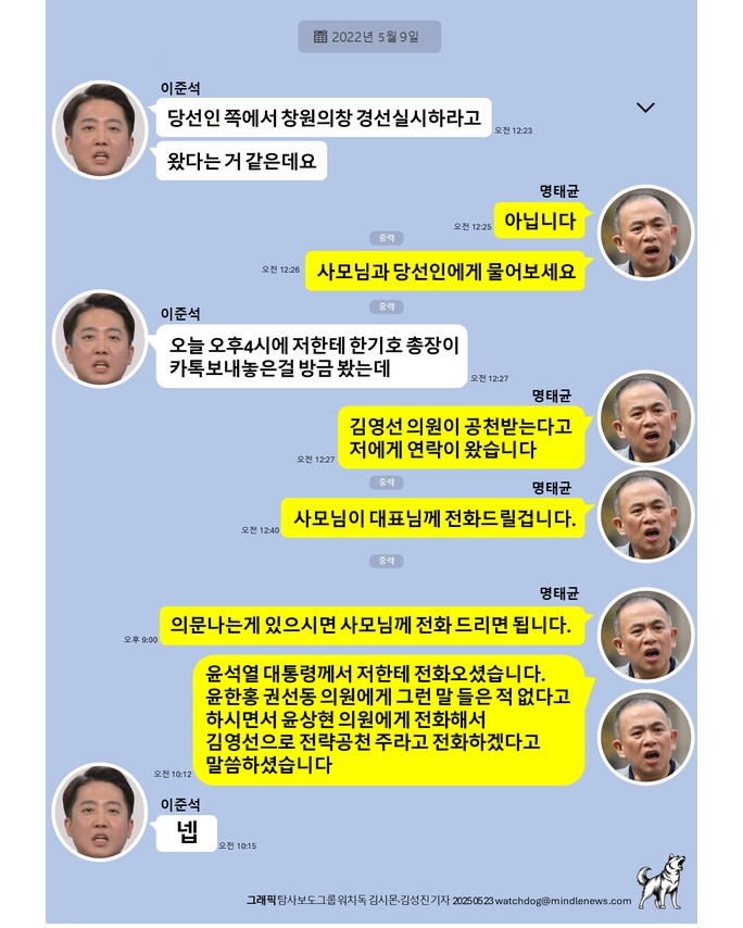 ´ëÈ´Â, ¸íűÕÀÌ ÀÌÁؼ®¿¡°Ô "»ç¸ð´ÔÀÌ ´ëÇ¥´Ô²² ÀüÈ µå¸± °Ì´Ï´Ù", "À±¼®¿ ´ëÅë·É²²¼µµ Àü·«°øÃµ ÁÖ¶ó°í À±»óÇö ÀÇ¿ø¿¡°Ô ÀüÈÇÏ°Ú´Ù°í ¸»¾¸Çϼ̽À´Ï´Ù"¶ó´Â ¹®ÀÚ¿¡ ÀÌÁؼ®ÀÌ "³Ü"À̶ó°í ´äÀåÇÑ °ÍÀ» È®ÀÎÇÑ °ÍÀ¸·Î, ¸íűհú ÀÌÁؼ®ÀÇ ÀÌ ´ëÈ´Â 2022³â 5¿ù 9ÀÏ ÀÌ·ïÁø °ÍÀ» º¸µµÇßÀ¸¸ç, ´ç½Ã ±¹¹ÎÀÇÈû ´ç ´ëÇ¥´Â ÀÌÁؼ®À¸·Î, ÀÌÆ±³¯ ±è¿µ¼±Àº °øÃµÀ» ¹Þ¾Ò´Ù.