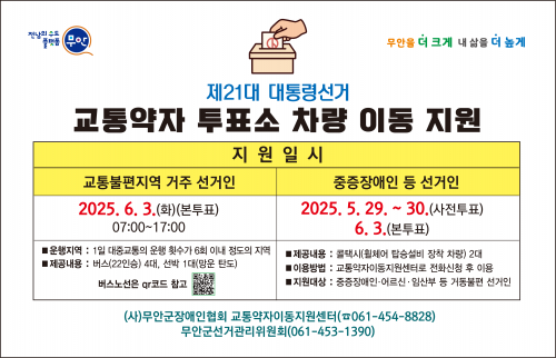 ÀÌ¿ë ½ÅûÀº ¿À´Â 6¿ù 3ÀϱîÁö ¹«¾È±º¼±°Å°ü¸®À§¿øÈ¸(¢Ï061-453-1390), ¹«¾È±º ±³Åë¾àÀÚÀ̵¿Áö¿ø¼¾ÅÍ(¢Ï061-454-8828)·Î ÇÏ¸é µÈ´Ù.