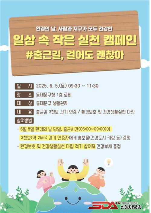 À̹ø Ä·ÆäÀÎÀº 6¿ù 5ÀÏ ¿ÀÀü 9½Ã 30ºÐºÎÅÍ 11½Ã 30ºÐ±îÁö µ¿´ë¹®±¸Ã» 1Ãþ ·Îºñ¿¡¼­ µ¿´ë¹®±¸ »ýȰ±ÇÀÚ¸¦ ´ë»óÀ¸·Î ¡®Ãâ±Ù±æ, °É¾îµµ ±¦Âú¾Æ¡¯¸¦ ÁÖÁ¦·Î ¿­¸°´Ù. Âü°¡ÀÚ´Â Ãâ±Ù±æ¿¡ 3000º¸(¾à 2km °Å¸® µµº¸)¸¦ °È°í ÀÎÁõÇÏ¸é µ¿´ë¹®±¸ ´ëÇ¥ ij¸¯ÅÍ ¡®µðµð¹Ì¡¯ ¿­¼è°í¸®¸¦ ¹ÞÀ» ¼ö ÀÖ´Ù. ¶ÇÇÑ È¯°æ º¸È£¿Í °Ç°­ÇÑ »ýȰ ½Çõ¿¡ ´ëÇÑ ´ÙÁüÀ» Æ÷½ºÆ®ÀÕ¿¡ Àû¾î °Ô½ÃÇÏ¸é ¡®°Ç°­ºÎ䡯µµ ÇÔ²² Á¦°øµÈ´Ù.