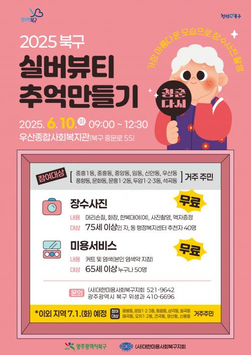 ¶ÇÇÑ ¡®Àå¼ö»çÁø ÃÔ¿µ¡¯Àº µ¿ ÇàÁ¤º¹Áö¼¾ÅÍ¿¡¼ »çÀü¿¡ ÃßõÇÑ ¸¸ 75¼¼ ÀÌ»ó ¾î¸£½Å 80¸íÀ» ´ë»óÀ¸·Î ¡ãÇì¾î(ĿƮ ¹× µå¶óÀÌ) ¡ã¸ÞÀÌÅ©¾÷ ¡ãÇѺ¹ ´ë¿© ¡ãÀå¼ö »çÁø ÃÔ¿µ ¡ã¾×ÀÚ Á¦ÀÛ µî Àü °úÁ¤À» Áö¿øÇÏ¿© ¾î¸£½ÅµéÀÇ Àå¼ö»çÁø ÃÔ¿µ °æÇèÀÌ ¼ÒÁßÇÑ Ãß¾ïÀ¸·Î ³²À» ¼ö ÀÖµµ·Ï µ½´Â´Ù.