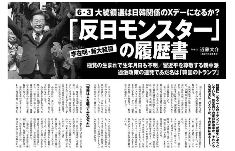 Áö³ 6ÀÏ ÀϺ» ÁÖ°£Áö ÁÖ°£Çö´ë´Â "'¹ÝÀÏ ¸ó½ºÅÍ' »õ ´ëÅë·É ÀÌÀç¸íÀÇ À̷¼"¶ó´Â Á¦¸ñÀÇ ±â»ç¿¡¼ ÀÌÀç¸í ´ëÅë·É¿¡ °üÇØ ¡®»ý³â¿ùÀϵµ ¸ð¸£´Â ±ØºóÇÑ Ãâ»ý, °ú°ÝÇÑ Á¤Ã¥ ¿¬¹ß·Î ¡®Çѱ¹ÀÇ Æ®·³ÇÁ¡¯¶ó´Â µî ¿ø»öÀûÀ¸·Î ºñ³Çϱ⠽ÃÀÛÇß´Ù.