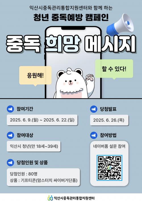 ½Ã´Â ÀÍ»ê½ÃÁßµ¶°ü¸®ÅëÇÕÁö¿ø¼¾ÅÍ(¼¾ÅÍÀå ÀÌÇö±â)¿Í ÇÔ²² û³â Áßµ¶ ¿¹¹æ°ú ȸº¹À» ÀÀ¿øÇÏ´Â 'Áßµ¶ Èñ¸Á ¸Þ½ÃÁö' Ä·ÆäÀÎÀ» ¿À´Â 22ÀϱîÁö ÁøÇàÇÑ´Ù°í 9ÀÏ ¹àÇû´Ù.