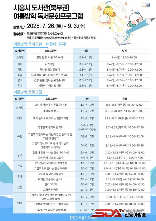 [½Åµ¿¾Æ¹æ¼Û ½ÃÈï½Ã=À̽ŵ¿±âÀÚ] ½ÃÈï½Ã´Â ¿©¸§¹æÇÐÀ» ¸Â¾Æ ºÏºÎ±Ç 8°³ °ø°øµµ¼­°ü(¼Ò·¡ºû¤ý´ë¾ß¤ý¸ñ°¨¤ý´É°î¤ýÀå°î¤ýÀº°è¤ý½Åõ¤ý¸ÅÈ­)ÀÌ 7¿ù 26ÀϺÎÅÍ 9¿ù 3ÀϱîÁö ¿©¸§µ¶¼­±³½Ç ¹× ¿©¸§¹æÇÐ ÇÁ·Î±×·¥À» ¿î¿µÇÑ´Ù°í ¹àÇû´Ù.