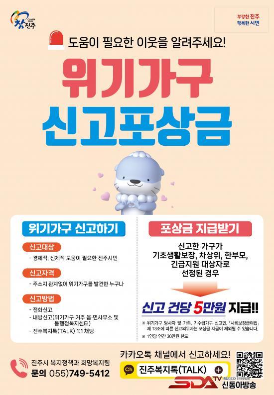 ¡®ÁøÁֽà À§±â°¡±¸ ½Å°íÆ÷»ó±Ý Á¦µµ¡¯´Â °æÁ¦Àû, ½ÅüÀû µµ¿òÀÌ ÇÊ¿äÇÑ ½Ã¹ÎÀ» ´ë»óÀ¸·Î À§±â°¡±¸ ¹ß°ß ½Å°í°¡ Á¢¼öµÇ¸é ½Ã´Â À¾¸éµ¿ »ó´ãÀ» ÅëÇØ ´ë»óÀÚ¿¡°Ô ÇÊ¿äÇÑ °ø°ø±Þ¿©³ª ¹Î°£¼­ºñ½º µîÀ» ¿¬°è Áö¿øÇϰí, ¹ß±¼µÈ À§±â°¡±¸°¡ ±âÃÊ»ýȰº¸Àå¼ö±ÞÀÚ, Â÷»óÀ§°èÃþ, ÇѺθð°¡Á·, ±ä±ÞÁö¿ø´ë»óÀÚ·Î ¼±Á¤µÉ °æ¿ì ½Å°íÀÚ¿¡°Ô Æ÷»ó±Ý 5¸¸ ¿øÀ» Áö±ÞÇÑ´Ù. ´Ü, ½Å°íÀÚ°¡ ½Å°íµÈ À§±â°¡±¸ ´ç»çÀÚÀ̰ųª °¡Á· ¹× ģô, »çȸº¸Àå±Þ¿©¹ý¿¡ µû¸¥ ½Å°íÀǹ«ÀÚÀÏ °æ¿ì´Â Áö±ÞÀÌ Á¦ÇÑµÇ¸ç µ¿ÀÏ ½Å°íÀÎÀº ¿¬°£ ÃÖ´ë 30¸¸ ¿ø À̳»¿¡¼­ Æ÷»ó±ÝÀ» Áö±Þ¹Þ°Ô µÈ´Ù.