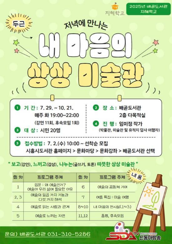¡®Àú³á¿¡ ¸¸³ª´Â ³» ¸¶À½ÀÇ »ó»ó¹Ì¼ú°ü¡¯ ÇÁ·Î±×·¥Àº 7¿ù 2ÀÏ ¿ÀÀü 10½ÃºÎÅÍ ½ÃÈï½Ãµµ¼­°ü ´©¸®Áý(https://lib.siheung.go.kr)À» ÅëÇØ ¼±Âø¼øÀ¸·Î ½ÅûÇÒ ¼ö ÀÖ´Ù.
