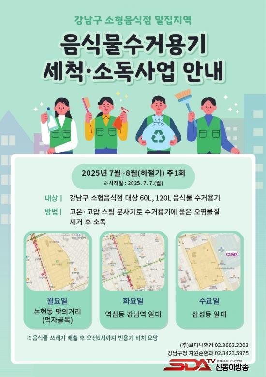 À̹ø »ç¾÷Àº °í¿Â´Ù½ÀÇÑ ¿©¸§Ã¶ ±âÈÄ·Î ÀÎÇØ À½½Ä¹° ¾²·¹±â ¼ö°Å¿ë±â¿¡¼­ ¹ß»ýÇÏ´Â ¾ÇÃë, ¹ú·¹, ÇØÃæ µî À§»ý ¹®Á¦¸¦ ¼±Á¦ÀûÀ¸·Î Â÷´ÜÇϱâ À§ÇÑ Á¶Ä¡´Ù. »ç¾÷ ´ë»óÀº ³íÇöµ¿ ¸ÀÀÇ °Å¸®(Çе¿·Î 2±æ), ¿ª»ïµ¿ °­³²¿ª ÀαÙ(Å×Çì¶õ·Î 1¡¤2±æ), »ï¼ºµ¿ ÀÏ´ë(Å×Çì¶õ·Î 81¡¤83±æ) µî À½½ÄÁ¡ ¹ÐÁý Áö¿ª ³» ¾à 600°÷À̸ç, °¢ ¾÷¼Ò¸¶´Ù 60L¿Í 120L ¼ö°Å ¿ë±â¸¦ ´ë»óÀ¸·Î ÁÖ 1ȸ¾¿ ÃÑ 8ȸ¿¡ °ÉÃÄ ¼¼Ã´ ¼­ºñ½º¸¦ Á¦°øÇÑ´Ù.