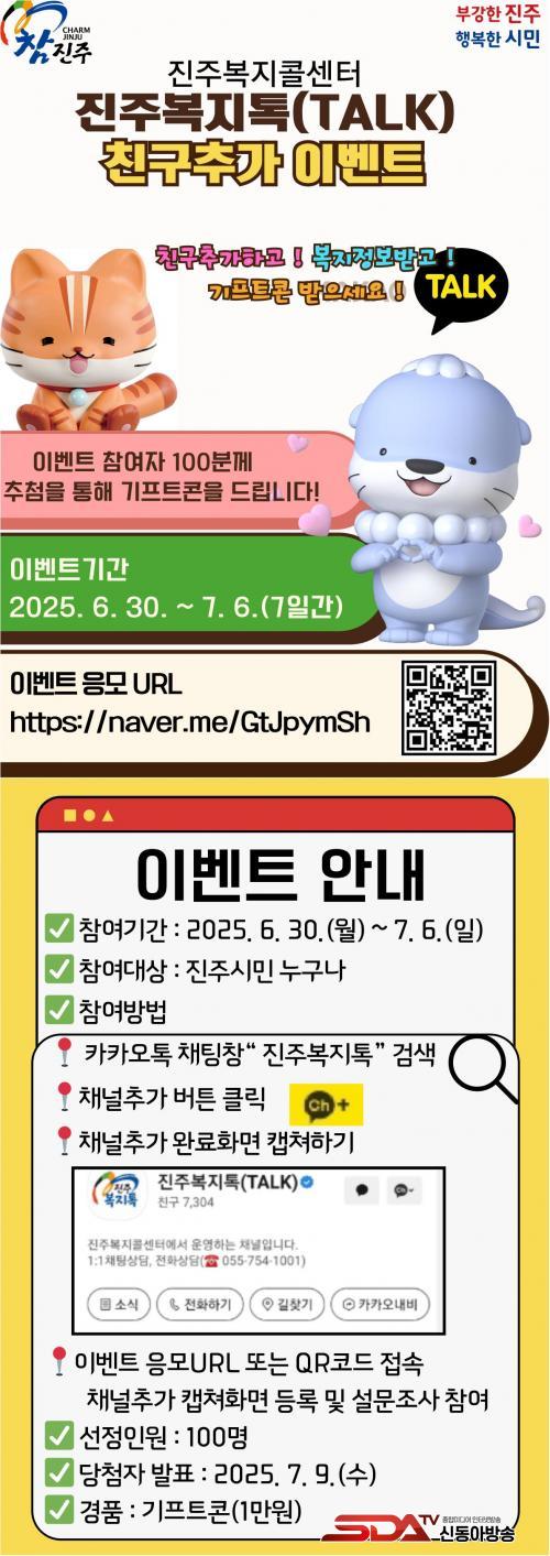 [½Åµ¿¾Æ¹æ¼Û °æ³²ÁøÁÖ=³²±Ã¿µ±â±âÀÚ] ÁøÁֽô º¹Áö Á¢±Ù¼ºÀ» ³ôÀÌ°í ½Ã¹Î°úÀÇ ¼ÒÅë°­È­¸¦ À§ÇØ, ÁøÁÖº¹ÁöÄݼ¾ÅÍ(ÀÌÇÏ Äݼ¾ÅÍ)¿¡¼­ ¿î¿µÇϴ¡®ÁøÁÖº¹ÁöÅå(TALK)¡¯Ã¤³ÎÀ» ÅëÇÑ Ä£±¸Ãß°¡ À̺¥Æ®¸¦ 6¿ù 30ÀϺÎÅÍ 7¿ù 6ÀϱîÁö 7Àϰ£ ÁøÇàÇÑ´Ù.