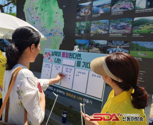 À̹ø Ä·ÆäÀÎÀº ½Ã¹ÎµéÀÌ ÀÏ»ó ¼Ó ¾ð¾î¸¦ ÅëÇØ ÆòÈ­¸¦ ½ÇõÇϰí ÅëÀÏ¿¡ ´ëÇÑ Èñ¸Á°ú ¹Ù¶÷À» ³ª´©±â À§ÇØ ¸¶·ÃµÆ´Ù. ÇöÀå¿¡¼­´Â ¡®³²ºÏÀÌ ÅëÀÏµÈ´Ù¸é ³ª´Â ¡Û¡ÛÀ» ±â´ëÇØ¿ä¡¯¶ó´Â ¹®±¸ ¾Æ·¡ Âü°¡ÀÚµéÀÌ ÀÚ½ÅÀÇ ¹Ù¶÷À» ´ãÀº ½ºÆ¼Ä¿¸¦ ºÙÀ̴ üÇè Ȱµ¿ÀÌ ÁøÇàµÆ´Ù.