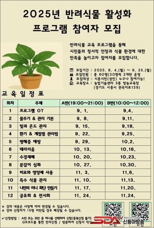 ¸ðÁý ÀοøÀº ÃÑ 60¸íÀ¸·Î, 30¸í¾¿ A¹Ý°ú B¹ÝÀ¸·Î ³ª´² ¿î¿µÇÑ´Ù. ½ÃÈï½Ã¿¡ °ÅÁÖÇÏ´Â ¼ºÀÎÀ̶ó¸é ´©±¸³ª ½Åû °¡´ÉÇϸç, ½ÅûÀº ¼±Âø¼øÀ¸·Î ÁøÇàµÈ´Ù. ±³À° Àå¼Ò´Â ½ÃÈï½Ã ³ó¾÷±â¼ú¼¾ÅÍ(°ü°îÁö·Î 139) 3Ãþ ¿µ³ó±³À°Àå¿¡¼­ ÀÌ·ïÁø´Ù. ±â°£Àº 9¿ù 1ÀϺÎÅÍ 11¿ù 24ÀϱîÁö ÃÑ 12ȸ·Î, A¹Ý°ú B¹ÝÀº °¢°¢ ÁÖ 1ȸ¾¿ ±³À°À» ¹Þ´Â´Ù.