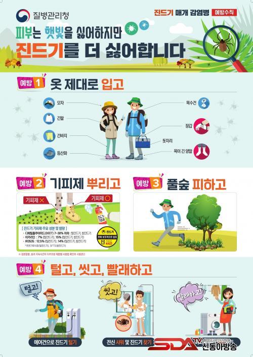 Áøµå±â ¸Å°³ °¨¿°º´ ¿¹¹æÀ» À§Çؼ´Â ¡ã¾ß¿Ü Ȱµ¿ ½Ã Áøµå±â ±âÇÇÁ¦ »ç¿ë ¹× ±ä¼Ò¸Å¡¤±ä¹ÙÁö¡¤¸ðÀÚ µî Âø¿ëÀ¸·Î ÇǺΠ³ëÃâ ÃÖ¼ÒÈ ¡ã¾ß¿ÜȰµ¿ ÈÄ Áï½Ã »þ¿ö ¹× ¿Ê °¥¾ÆÀԱ⠡ã¾ó±¼, ±Í, ¸öÅë µî¿¡ Áøµå±â ºÎÂø ¿©ºÎ È®ÀÎ µîÀÇ ¼öÄ¢À» ÁöÄÑ¾ß ÇÑ´Ù.