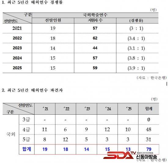 Çѱ¹ÀºÇàÀº ¸Å³â ¾à 15¸íÀ» ¼±¹ßÇØ ÇØ¿Ü MBA¡¤¼®¹Ú»ç °úÁ¤ ¿¬¼ö¿¡ µî·Ï±Ý¡¤Ã¼Àçºñ¡¤Ç×°øºñ¸¦ Àü¾× Áö¿øÇÏ°í ¿ù±Þ±îÁö Áö±ÞÇϰí ÀÖ´Ù. ÃÖ±Ù 5³â°£(2021~2025³â) ÃÑ 79¸í¿¡°Ô 77¾ï 1,800¸¸ ¿øÀÌ Áö¿øµÇ¾úÀ¸³ª, ÀÌ °¡¿îµ¥ 9¸í(11.4%)ÀÌ Á¶±â Åð»çÇÑ °ÍÀ¸·Î ³ªÅ¸³µ´Ù.
