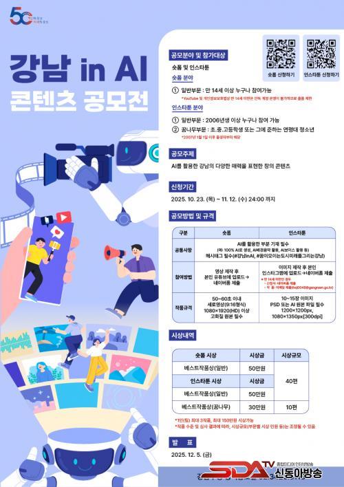 °ø¸ð ÁÖÁ¦´Â ¡®AI¸¦ Ȱ¿ëÇØ °­³²±¸ÀÇ ¸Å·Â°ú µµ½Ã À̹ÌÁö¸¦ âÀÇÀûÀ¸·Î Ç¥Çö¡¯ÇÏ´Â °ÍÀÌ´Ù. ¿¹ÄÁ´ë ¡ãAI¿Í ÇÔ²²ÇÏ´Â ÄÚ¿¢½º, ºÀÀº»ç, ¼±Á¤¸ª, ¾çÀçõ µî ·£¼± ¿©Çà ¡ã°­³²ÀÇ KºäƼ, ÀÇ·á°ü±¤, ÆÐ¼Ç, ½ºÅ¸Æ®¾÷ ¡ã°¡Á·ÀÌ ÇÔ²²ÇÏ´Â À°¾Æ¡¤±³À°¡¤º¹Áö¡¤Èú¸µ µµ½Ã µî ´Ù¾çÇÑ ¸Å·ÂÀ» AI µµ±¸¸¦ Ȱ¿ëÇØ âÀÇÀûÀ¸·Î ´ã¾Æ³»¸é µÈ´Ù.
