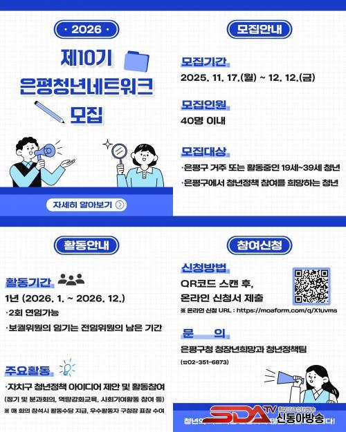 ½ÅûÀº ÀºÆò±¸¿¡ °ÅÁÖÇϰųª, Á÷Àå ¹× ¾÷¹« µîÀ¸·Î ÀºÆò±¸¿¡¼ Ȱµ¿ÇÏ´Â 19¼¼ ÀÌ»ó 39¼¼ ÀÌÇÏ Ã»³âÀÌ¸é ´©±¸³ª ÇÒ ¼ö ÀÖ´Ù. ¸ðÁýÀοøÀº 40¸í À̳»·Î ´ÙÀ½´Þ 12ÀϱîÁö ¿Â¶óÀÎÀ¸·Î Á¢¼öÇÏ¸é µÈ´Ù.