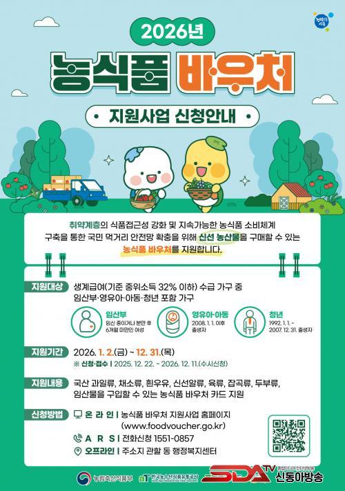 ½Åû ±â°£Àº 2025³â 12¿ù 22ÀϺÎÅÍ 2026³â 12¿ù 11ÀϱîÁö´Ù. ÁÖ¼ÒÁö °üÇÒ µ¿ ÇàÁ¤º¹Áö¼¾ÅÍ ¹æ¹®, ¿Â¶óÀÎ(www.foodvoucher.go.kr) ¶Ç´Â ÀÚµ¿ ÀÀ´ä ½Ã½ºÅÛ(1551-0857)À» ÅëÇØ¼µµ ½ÅûÇÒ ¼ö ÀÖ´Ù.