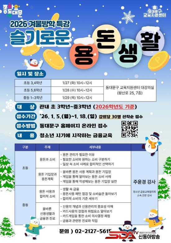 [½Åµ¿¾Æ¹æ¼Û µ¿´ë¹®±¸=À̽ŵ¿±âÀÚ]¼­¿ï µ¿´ë¹®±¸´Â °Ü¿ï¹æÇÐÀ» ¸Â¾Æ ÃÊ¡¤ÁßÇлýÀ» ´ë»óÀ¸·Î ¡®°ú¸ñº° ÇнÀ¹ý¡¯°ú ¡®½½±â·Î¿î ¿ëµ·»ýȰ¡¯ Ư°­À» ¿î¿µÇÑ´Ù°í 7ÀÏ ¹àÇû´Ù. ¹æÇÐ µ¿¾È È寮·¯Áö±â ½¬¿î ÇнÀ ¸®µëÀ» ´Ù½Ã Àâ°í, û¼Ò³â±â¿¡ ²À ÇÊ¿äÇÑ ±âÃÊ ±ÝÀ¶ °¨°¢±îÁö ÇÔ²² Ű¿ìµµ·Ï ¡®ÇнÀ¡¤±ÝÀ¶¡¯ µÎ ÃàÀ» ÇÑ ÇÁ·Î±×·¥¿¡ ´ãÀº °ÍÀÌ Æ¯Â¡ÀÌ´Ù. °­ÀÇ´Â µ¿´ë¹®±¸ ±³À°Áö¿ø¼¾ÅÍ(¿Õ»ê·Î 25, 7Ãþ)¿¡¼­ ÁøÇàµÈ´Ù.